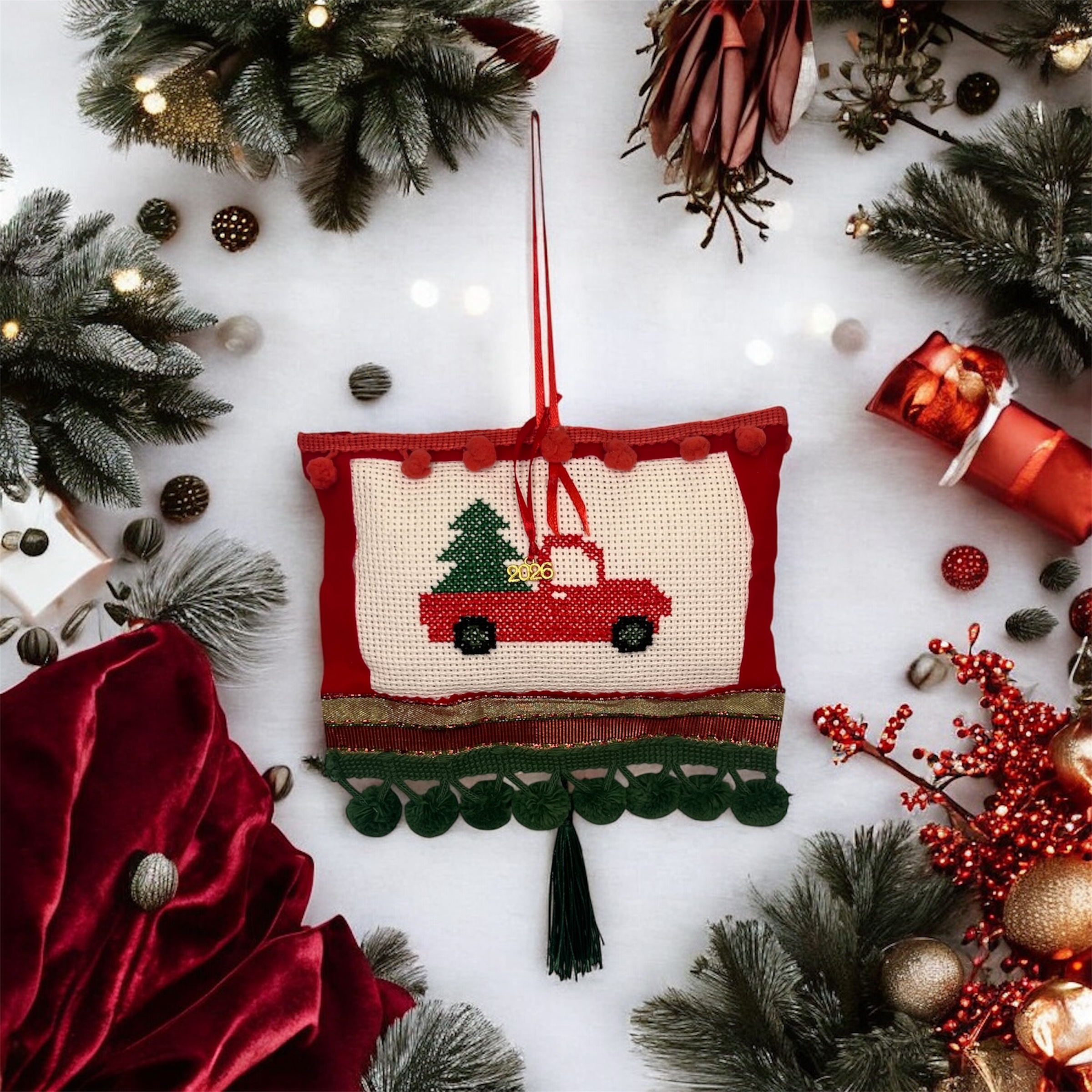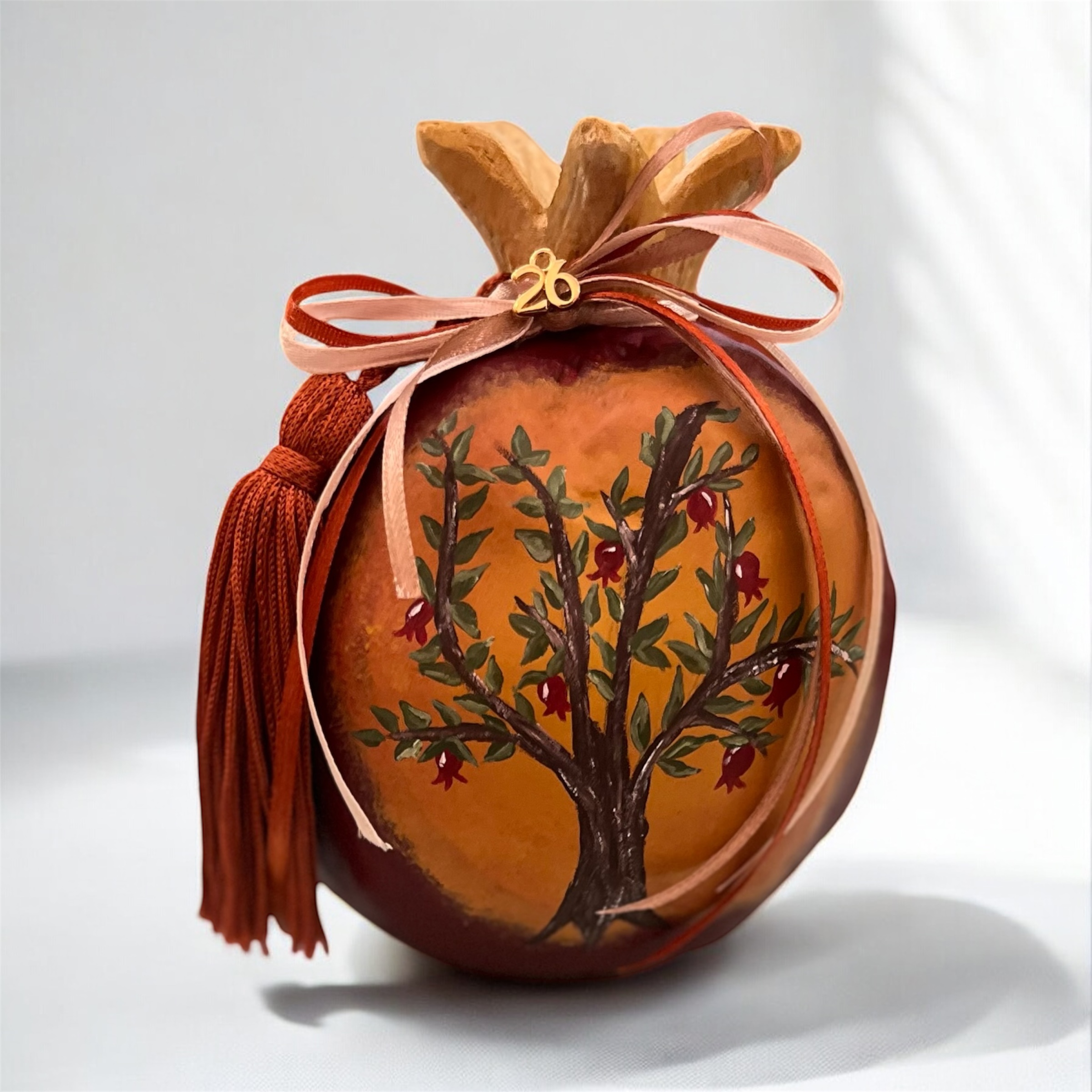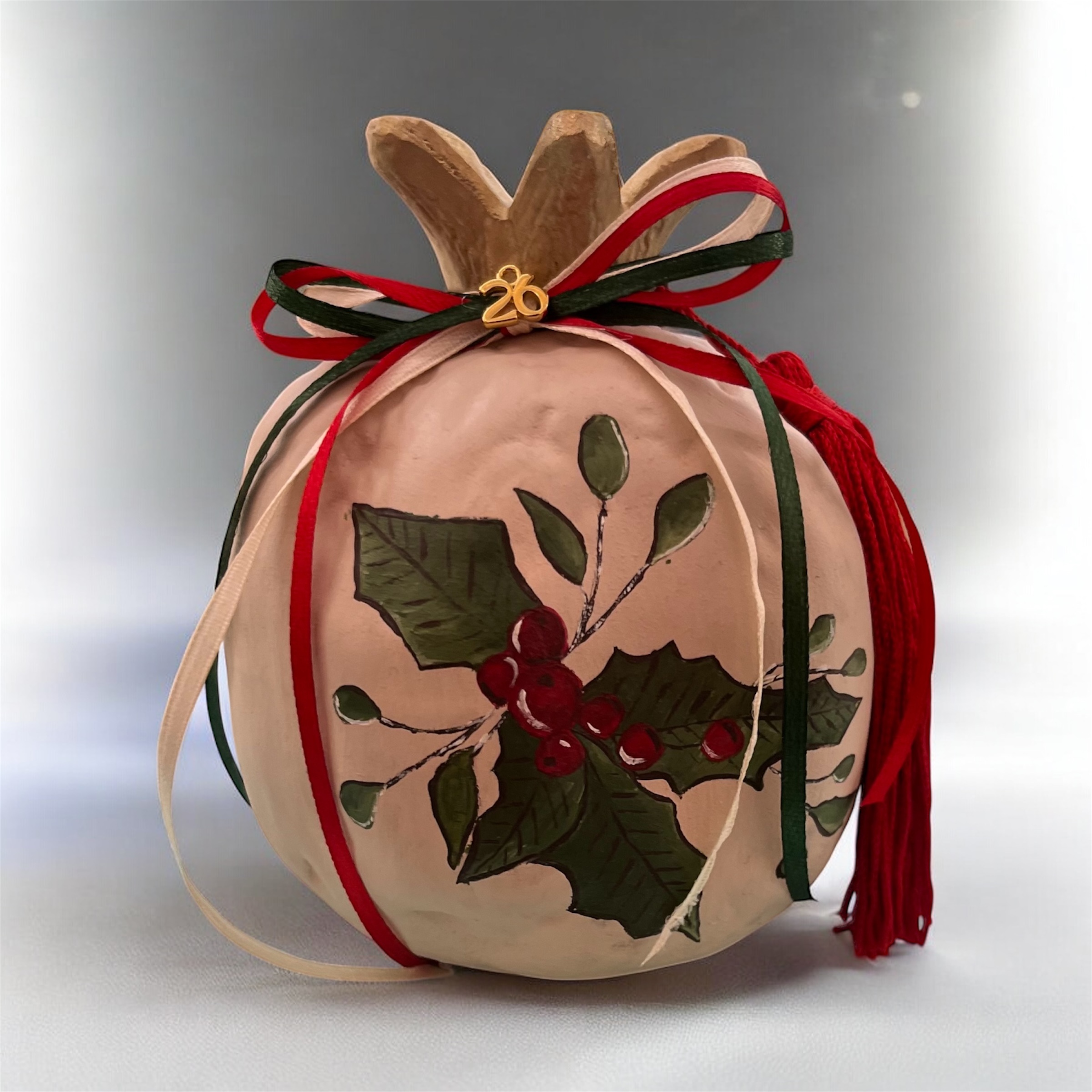 Διακοσμημένο με κόκκινες, πράσινες και εκρού κορδέλες, καθώς και χρυσό στοιχείο “26”, αποτελεί ένα μοναδικό δώρο για το σπίτι ή το γραφείο. Η χειροποίητη υφή και οι λεπτομέρειες στη ζωγραφική κάνουν κάθε κομμάτι πραγματικά μοναδικό.