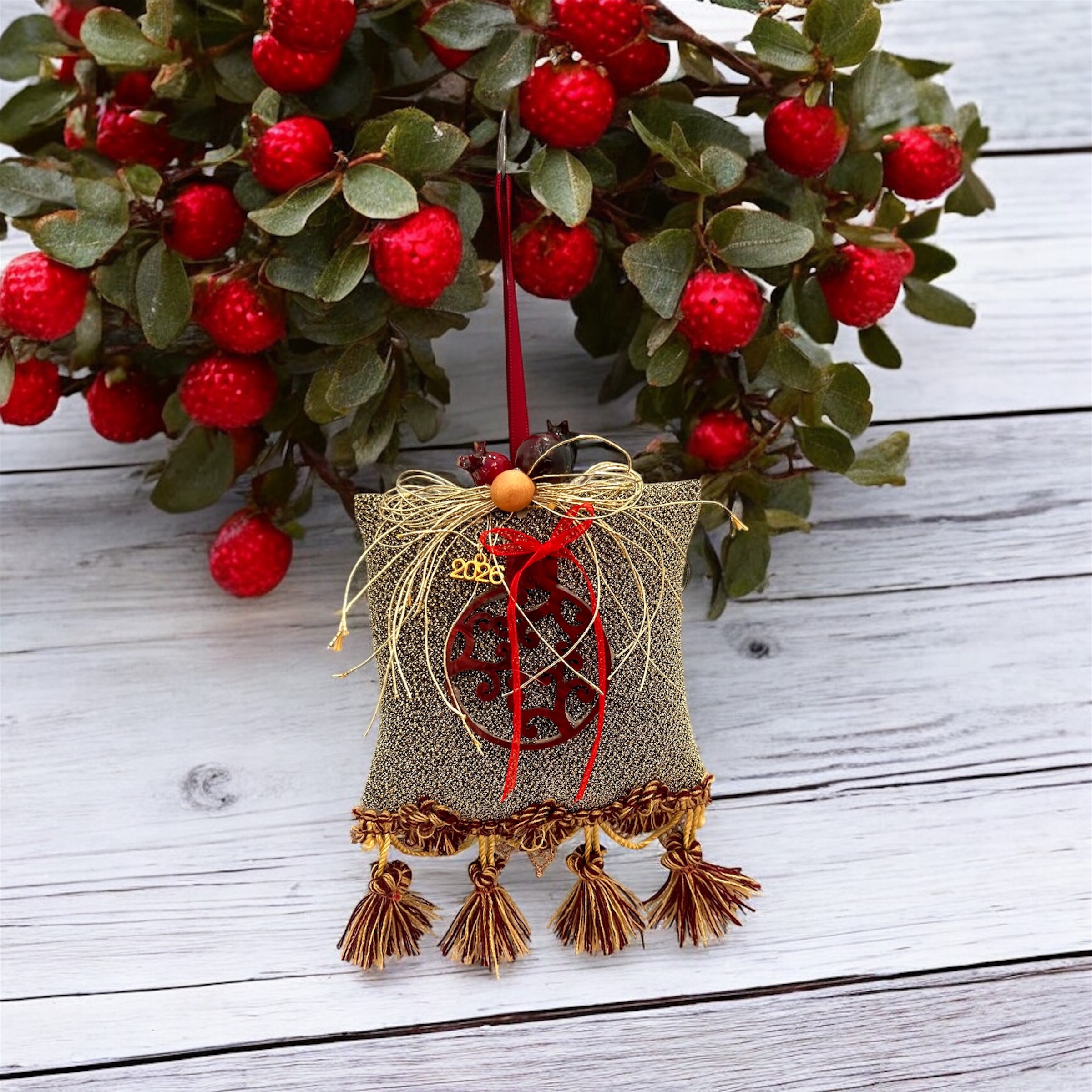 Χειροποίητο γούρι εμπνευσμένο από τον Καρυοθραύστη, με σκούρο μπλε ύφασμα, χρυσά κεντήματα, κόκκινα πομπον και πλούσια χρυσή μεταλλική φούντα, ιδανικό για να φέρει τύχη και κομψότητα στη νέα χρονιά.