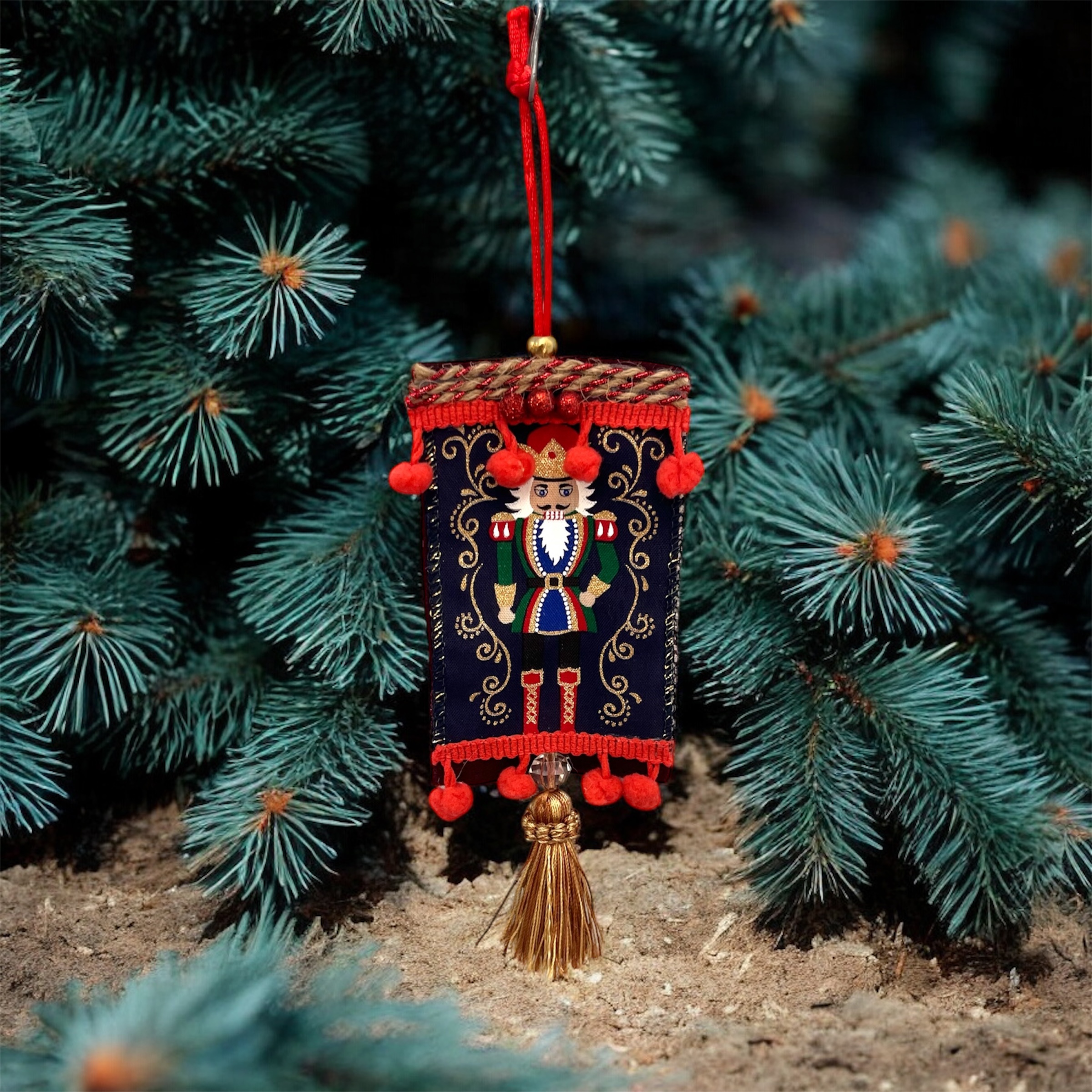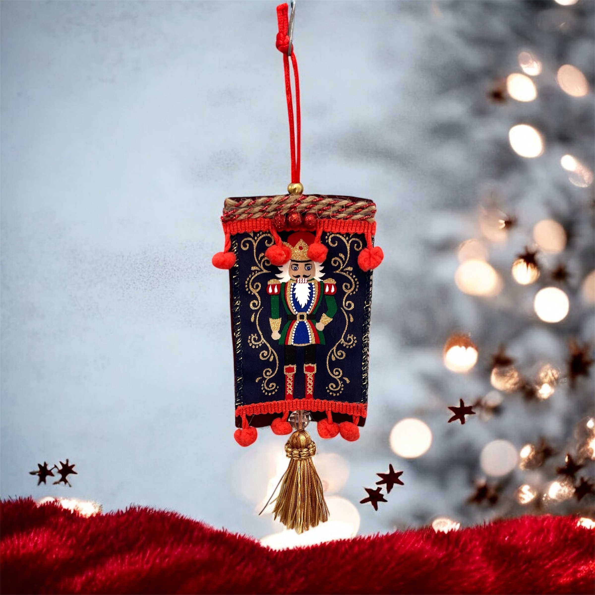 Ένα εντυπωσιακό γούρι εμπνευσμένο από τον κλασικό Καρυοθραύστη, σχεδιασμένο για να φέρει τύχη και αρχοντιά στη νέα χρονιά. Το κεντρικό του τμήμα είναι ένα πλούσιο σκούρο μπλε ύφασμα, διακοσμημένο με χρυσά κεντήματα. Στο κέντρο δεσπόζει η φιγούρα του Καρυοθραύστη με τη μεγαλοπρεπή στολή του. Το γούρι είναι στολισμένο με μικρές, κόκκινες φουντίτσες που προσδίδουν όγκο και παιχνιδιάρικη διάθεση. Στο κάτω μέρος, μια πλούσια, χρυσή μεταλλική φούντα ολοκληρώνει την εμφάνιση, συμβολίζοντας τον πλούτο, την ευημερία και την αφθονία. Κρεμιέται εύκολα με κόκκινο κορδόνι και είναι το τέλειο  δώρο για να ευχηθείτε “Καλή Χρονιά” με στυλ και πολυτέλεια.