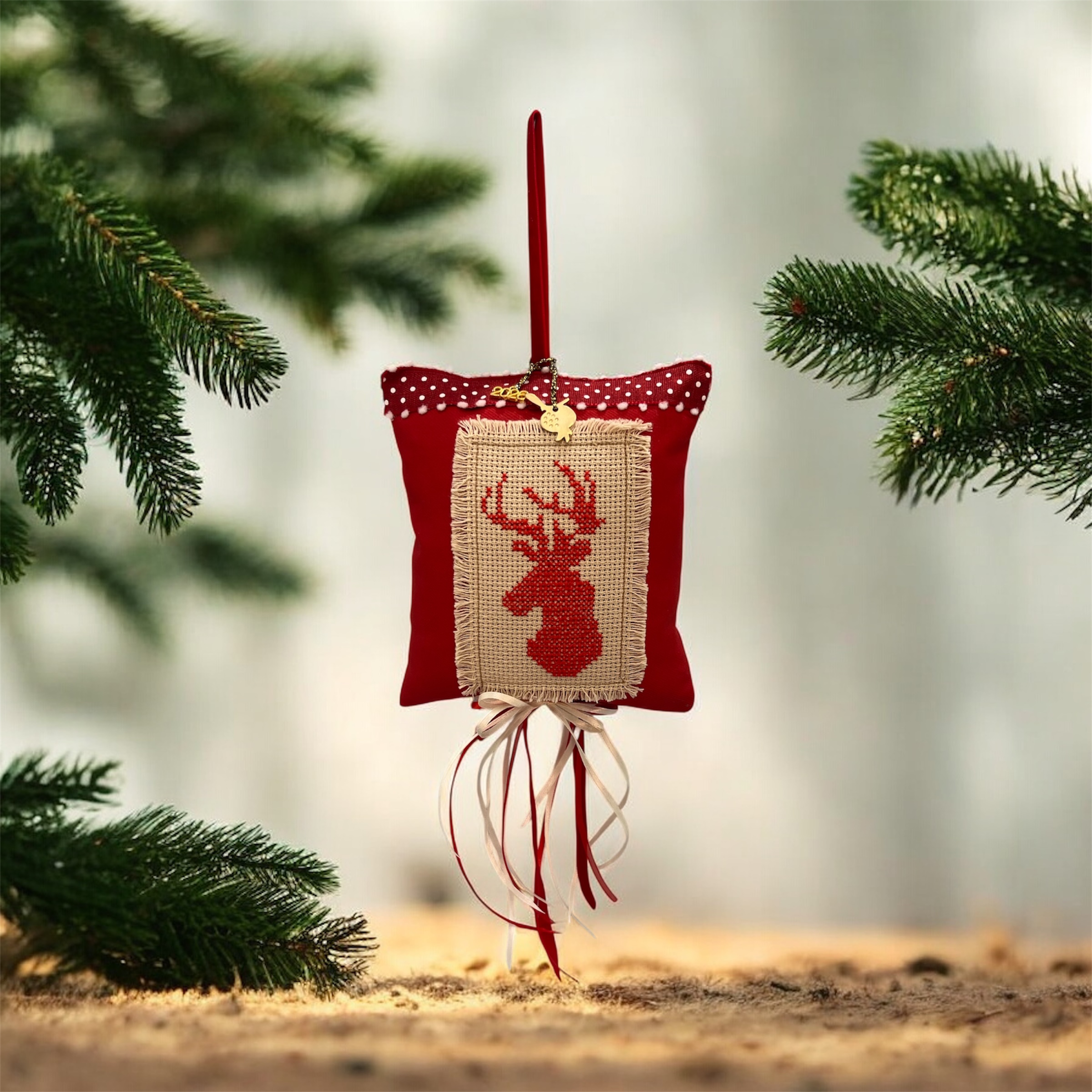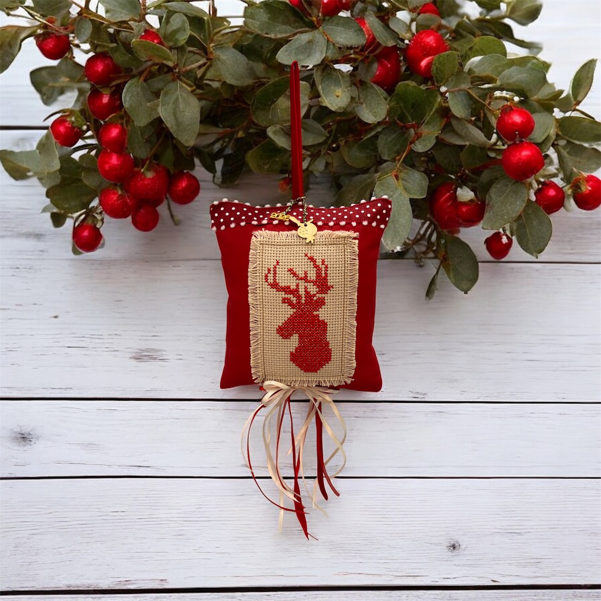 Χειροποίητο γούρι κεντημένο στο χέρι με σχέδιο ελαφιού πάνω σε κόκκινο υφασμάτινο μαξιλαράκι, πουά λεπτομέρειες και γιορτινές κορδέλες. Ιδανικό για χριστουγεννιάτικο στολισμό ή ως δώρο για τη νέα χρονιά.