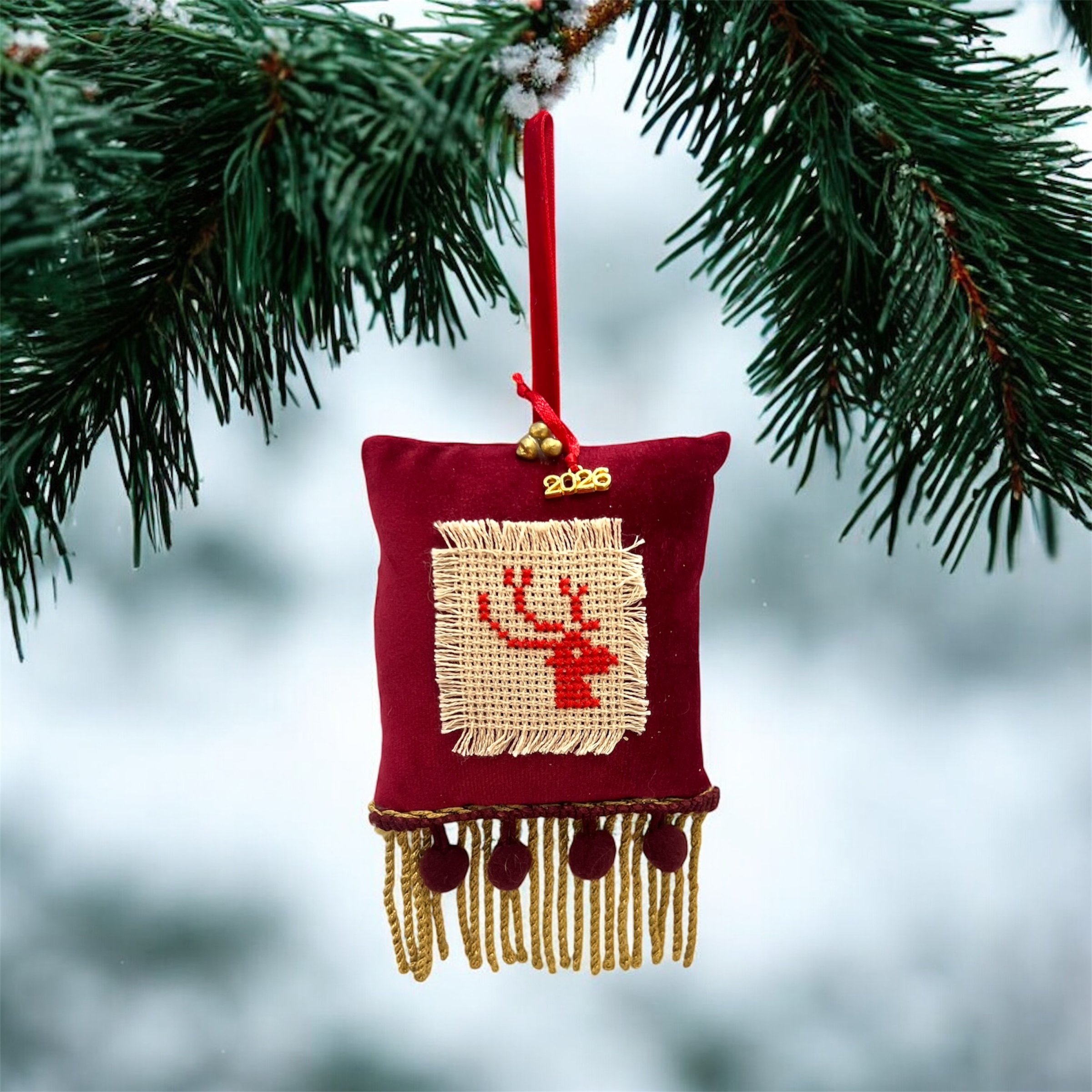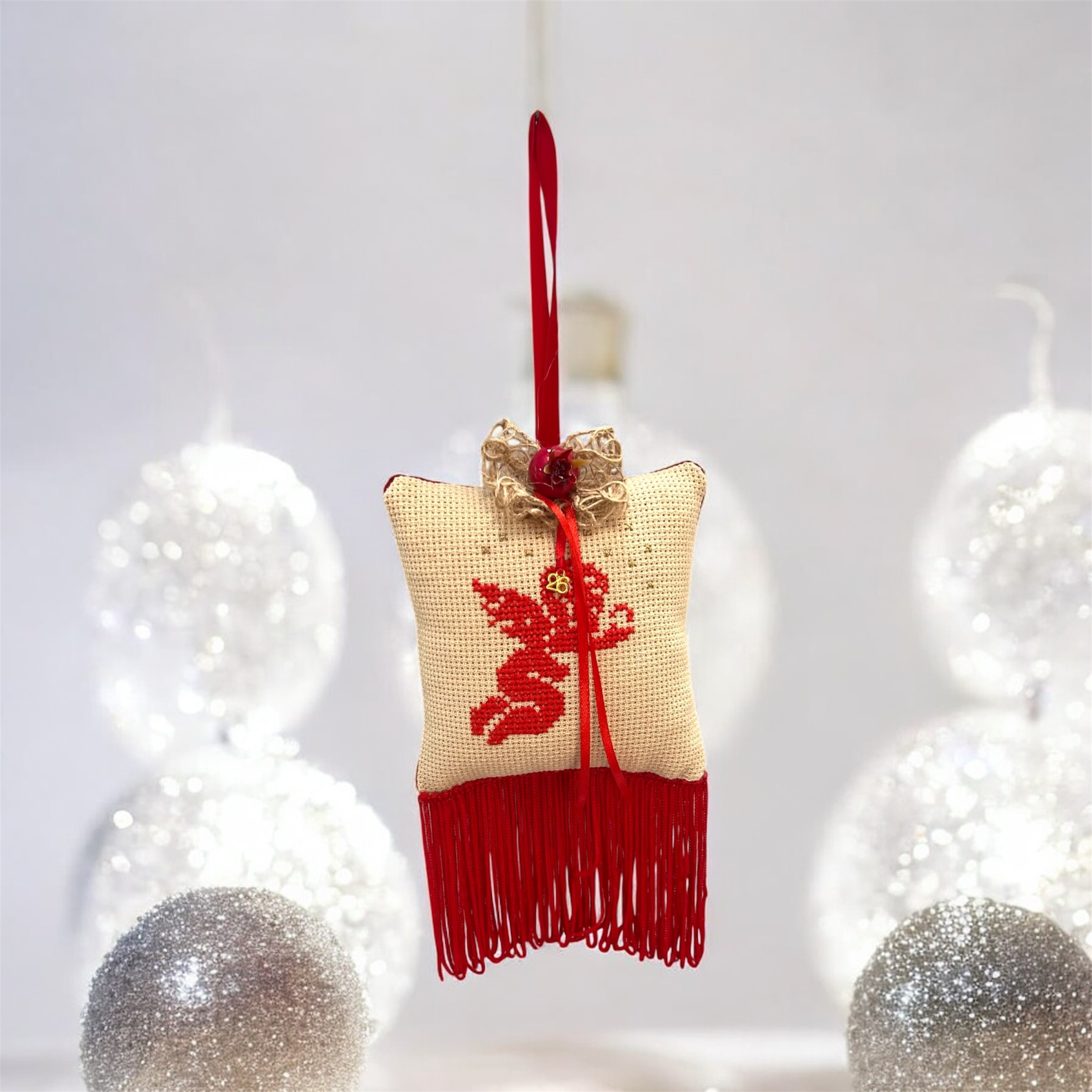 Χειροποίητο γούρι κεντημένο σε σταυροβελονιά με φιγούρα Άγγελου σε κόκκινο χρώμα, διακοσμημένο με πλούσια κόκκινα κρόσσια και χρυσαφένιο φιόγκο. Ένα πρωτότυπο δώρο που συμβολίζει την προστασία και την ευλογία για τη νέα χρονιά.