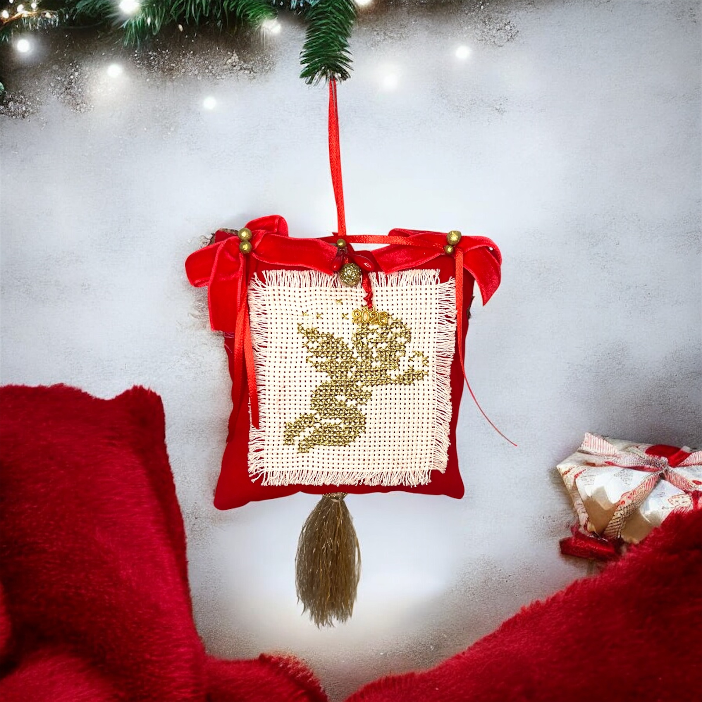 Χειροποίητο κρεμαστό γούρι με κέντημα αγγέλου σε χρυσές αποχρώσεις, διακοσμημένο με κόκκινες κορδέλες και χρυσή φούντα. Ιδανικό για χριστουγεννιάτικη διακόσμηση ή ως δώρο σε αγαπημένα πρόσωπα.