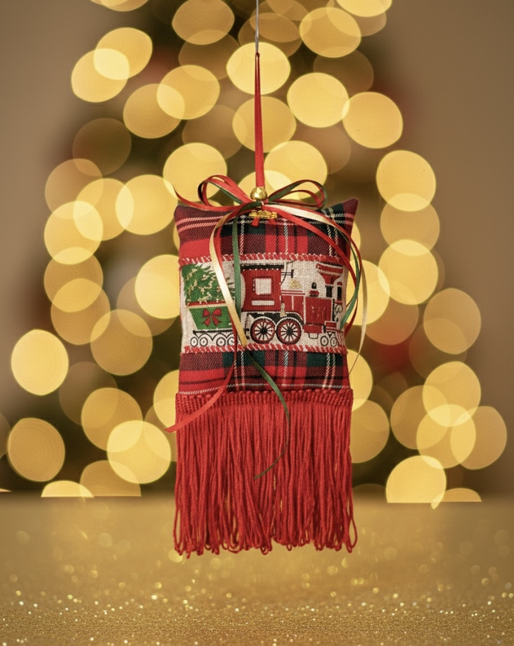 Ένα κομψό και γιορτινό γούρι που φέρνει λάμψη και θετική ενέργεια στον χώρο σας. Το διακοσμητικό διαθέτει υφασμάτινη επιφάνεια με κεντημένο στο χέρι αστέρι σε κόκκινες αποχρώσεις, ενώ στο κάτω μέρος στολίζεται με πλούσια κόκκινα κρόσσια που του δίνουν παραδοσιακό χαρακτήρα. Η κόκκινη κορδέλα και η χρυσή λεπτομέρεια στην κορυφή ολοκληρώνουν την εορταστική του εμφάνιση.