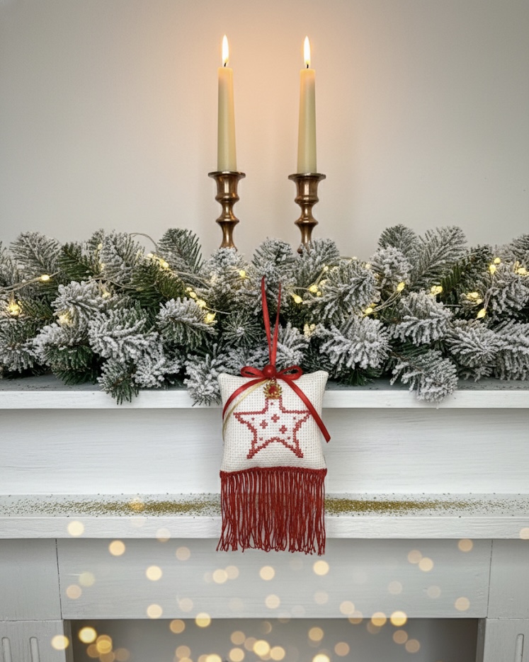 Κρεμαστό χριστουγεννιάτικο γούρι με κεντητό αστέρι, κόκκινα κρόσσια και γιορτινές κορδέλες. Ιδανικό για διακόσμηση ή ως δώρο για τη νέα χρονιά.