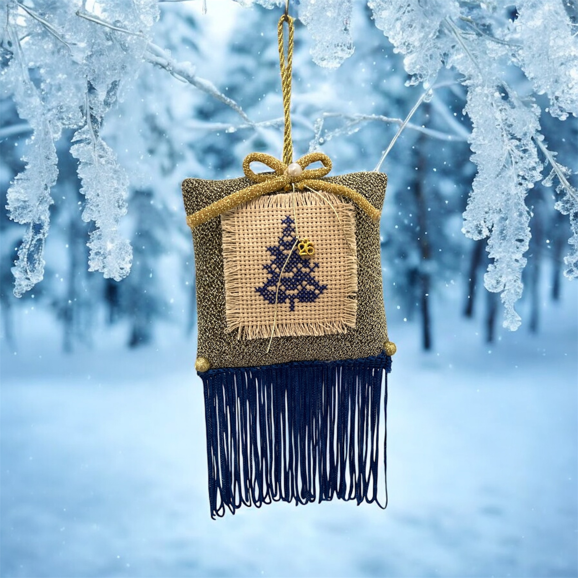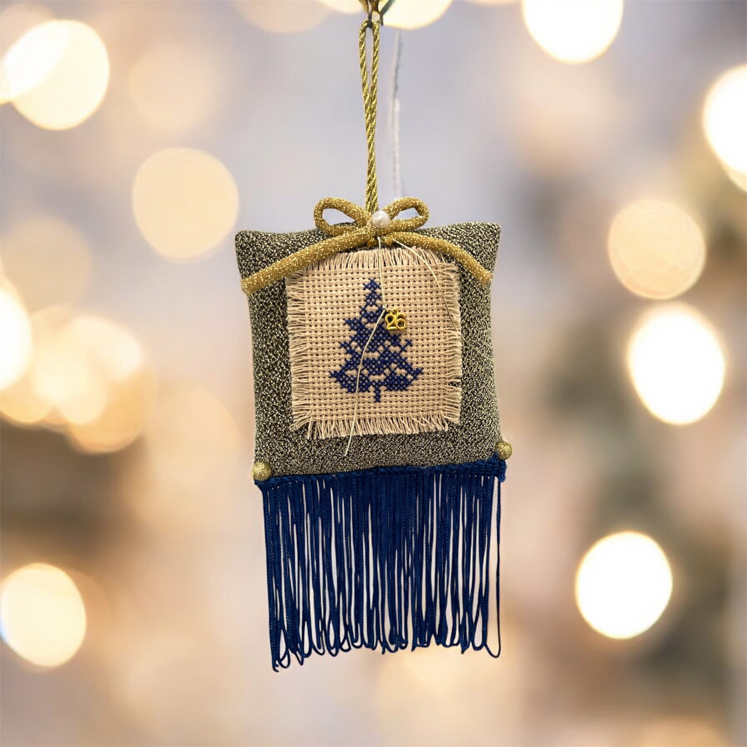 Χειροποίητο γούρι ιδανικό δώρο για τη νέα χρονιά. Διαθέτει χειροποίητο κέντημα Χριστουγεννιάτικου Δέντρου ενσωματωμένο σε μαξιλαράκι σε χρυσούς τόνους, ενώ το εντυπωσιακό μπλε κρόσσι και ο χρυσός φιόγκος του δίνουν μια ξεχωριστή, πολυτελή όψη.