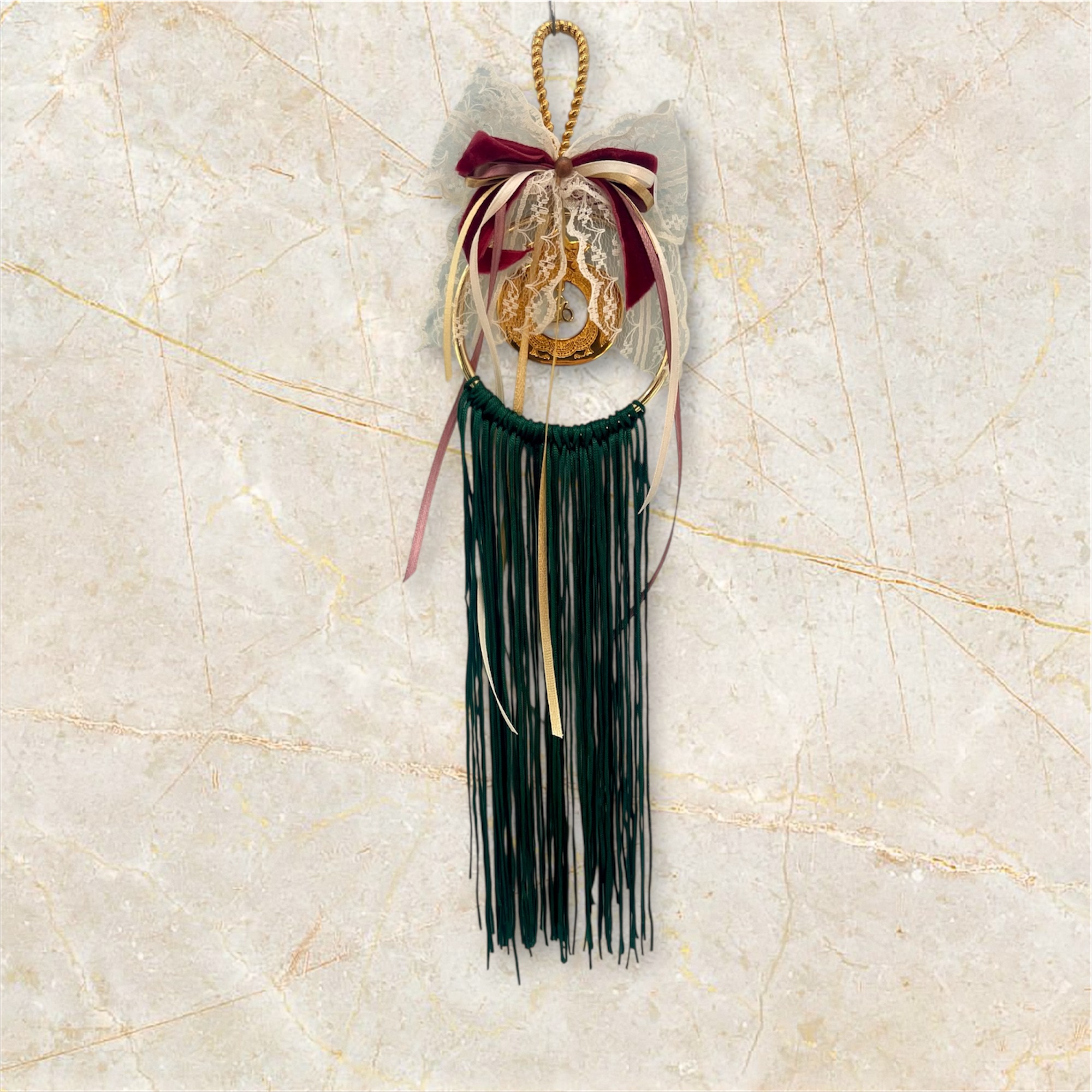 Χειροποίητο γούρι κεντημένο στο χέρι με γήινα χρώματα και διακοσμημένο με φούντα και κορδέλες.