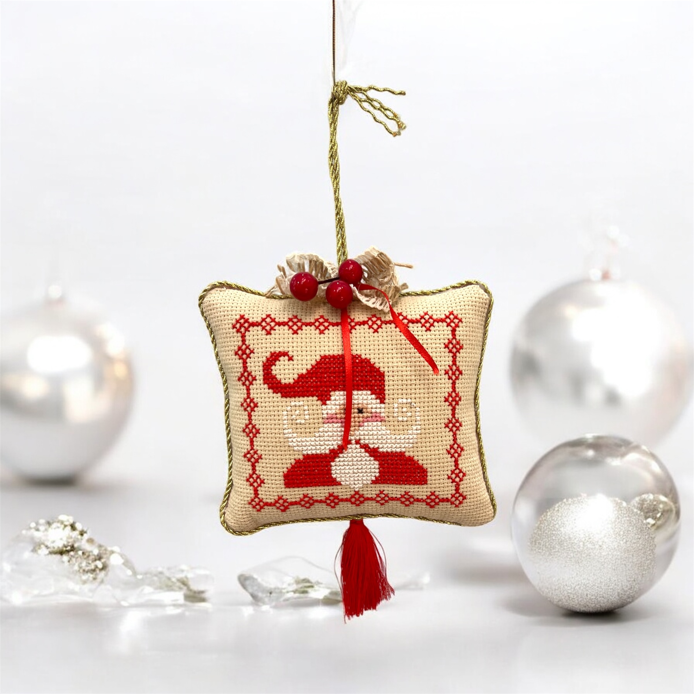 Το γούρι είναι διακοσμημένο με εορταστικές λεπτομέρειες, όπως κόκκινες πινελιές, πράσινο πλεγμένο κορδόνι και εντυπωσιακή φουντίτσα με μεταλλικό στοιχείο. Το εξωτερικό πλαίσιο από καρό ύφασμα σε κόκκινους και πράσινους τόνους δίνει μια ζεστή, κλασική χριστουγεννιάτικη αισθητική.