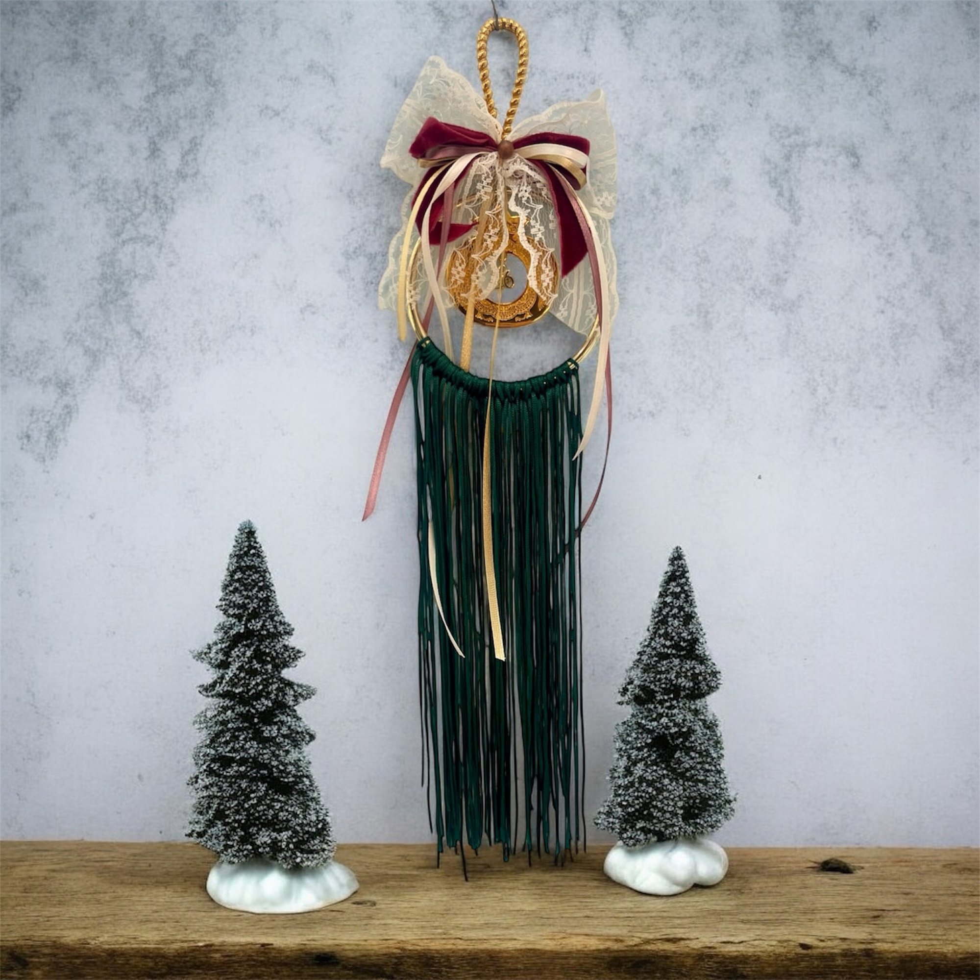 Χειροποίητο γούρι 2026 με χρυσό ρόδι, φιόγκο από δαντέλα και κορδέλες σε μπεζ και μπορντώ αποχρώσεις, και εντυπωσιακά πράσινα κρόσια. Ένα κομψό γούρι που φέρνει τύχη, αφθονία και θετική ενέργεια για τη νέα χρονιά.