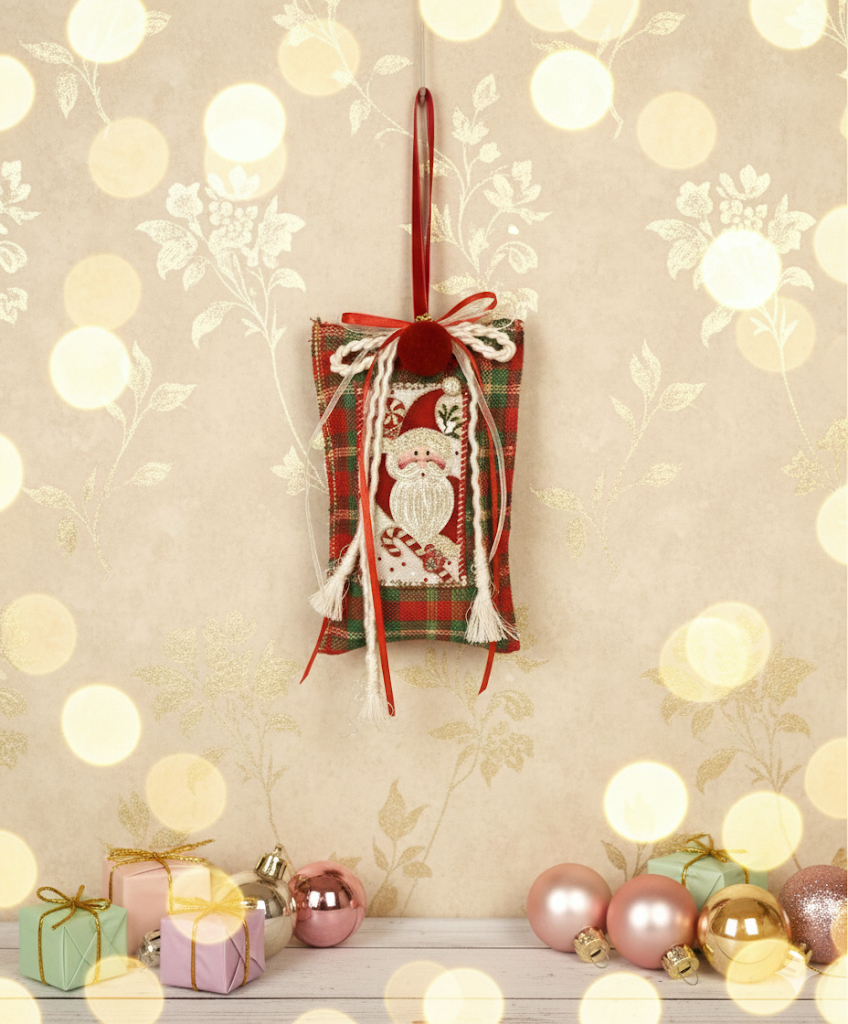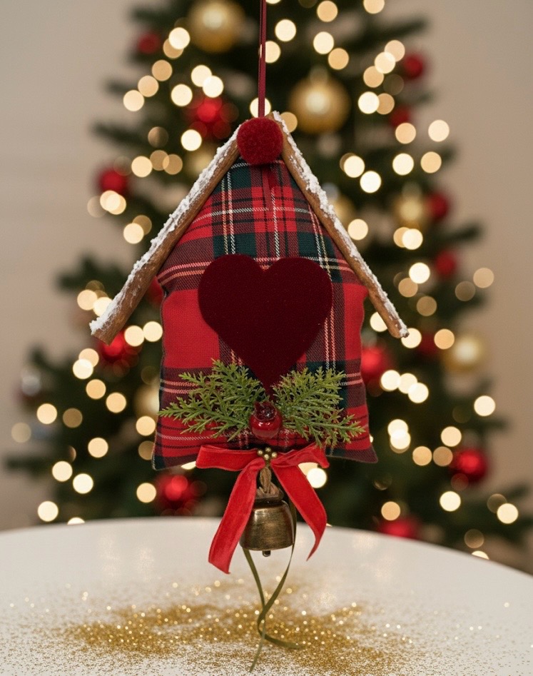 Χριστουγεννιάτικο γούρι σε σχήμα σπιτιού από καρό ύφασμα, με βελούδινη καρδιά, ξύλινες κανέλες, ροδάκια κλαδιά έλατου και μεταλλικό κουδουνάκι. Ιδανικό για πόρτες, τζάκια και ως εορταστικό δώρο.
