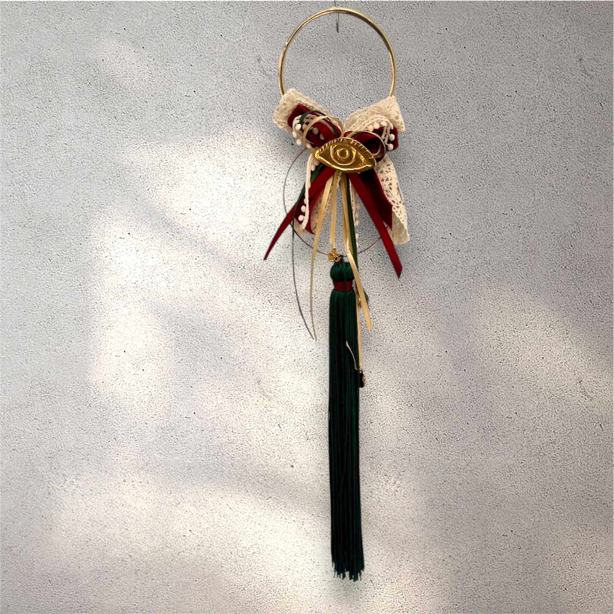 Χειροποίητο γούρι  με χρυσό στεφάνι ελιάς και εντυπωσιακή κανελί φούντα. Ένα διαχρονικό σύμβολο ειρήνης, τύχης και ευημερίας, ιδανικό για τη διακόσμηση του σπιτιού σας, η και ως ξεχωριστό γιορτινό δώρο στα αγαπημένα σας πρόσωπα.