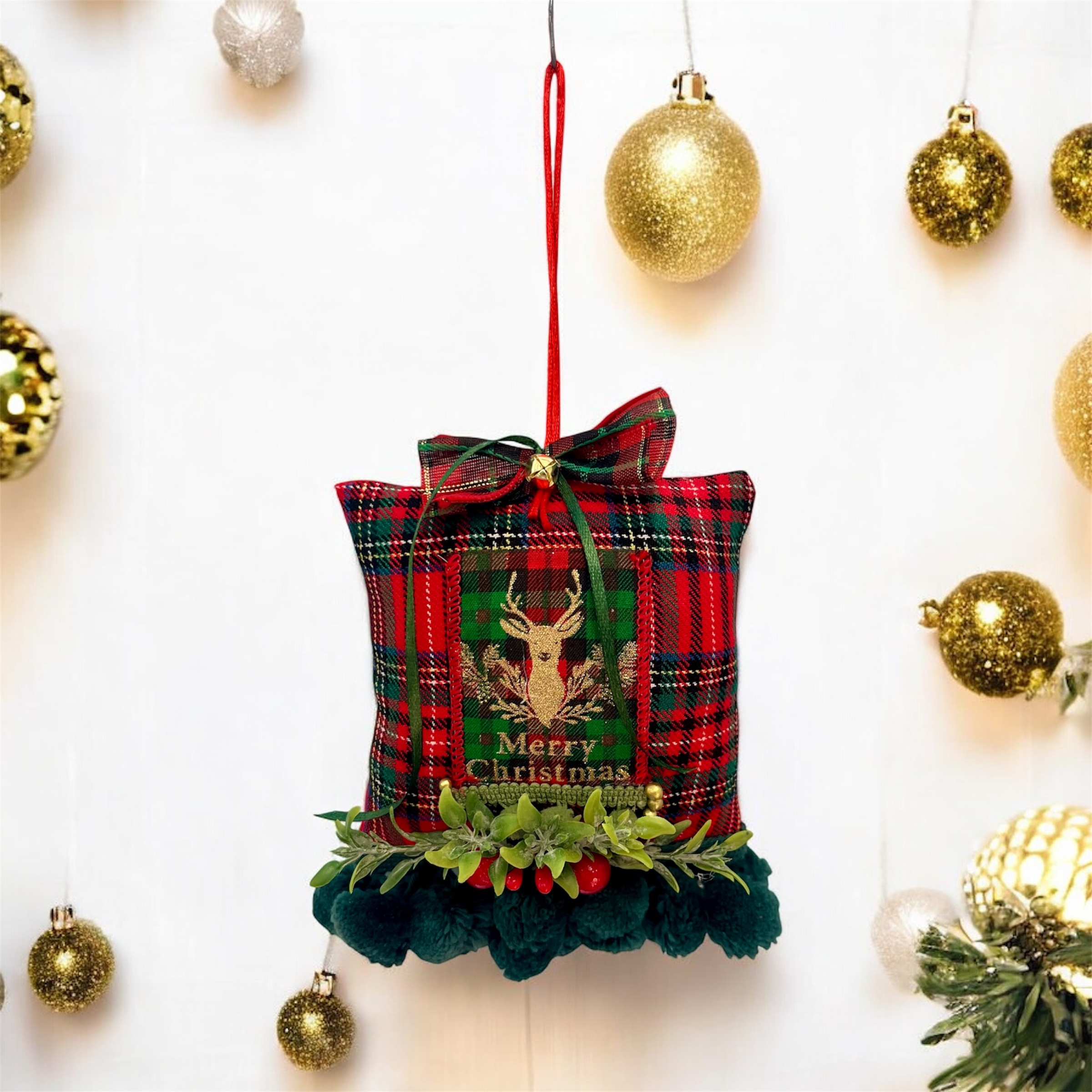 Χειροποίητο χριστουγεννιάτικο γούρι με υφασμάτινο καρό μαξιλαράκι σε κόκκινες και πράσινες αποχρώσεις, διακοσμημένο με χρυσό ελαφάκι και την ευχή Merry Christmas. Συμπληρώνεται με φιόγκο, γιορτινό πράσινο διάκοσμο και κόκκινες λεπτομέρειες, σύμβολο χαράς, τύχης και ζεστασιάς για τη νέα χρονιά.