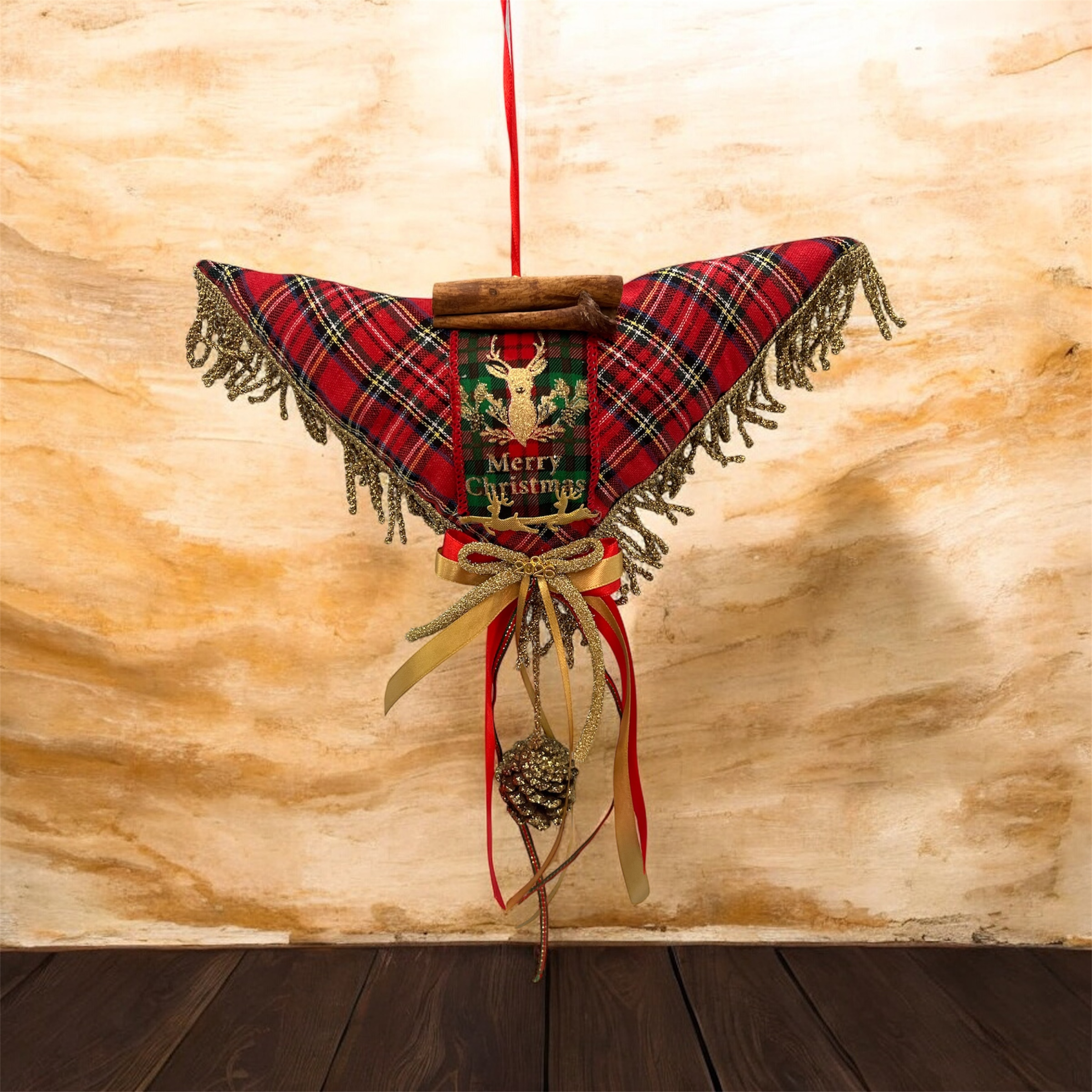 Χειροποίητο γούρι με καρό χριστουγεννιάτικο ύφασμα, χρυσές λεπτομέρειες και μοτίβο τάρανδου. Διακοσμημένο με κορδέλες και χρυσή κουκουνάρα, ιδανικό για εορταστικό στολισμό ή ως δώρο για τη νέα χρονιά.