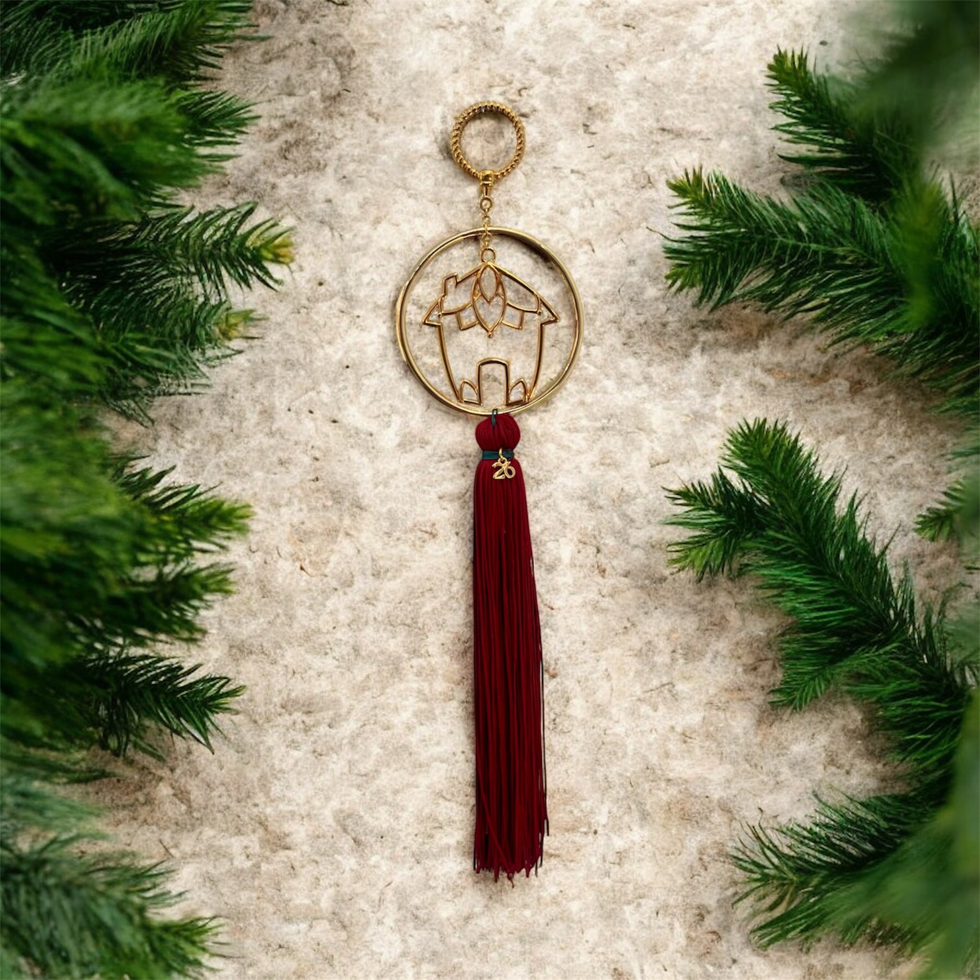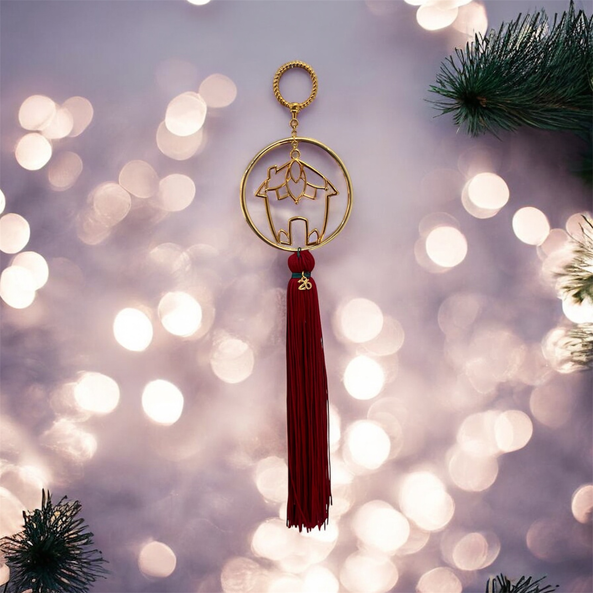 Το μεταλλικό στοιχείο σε χρυσό χρώμα σχηματίζει ένα σπίτι με λεπτομέρεια λουλουδιού στην οροφή, μέσα σε ένα χρυσό κρίκο, ένα σχήμα που αντιπροσωπεύει την πληρότητα και τη διαρκή αρμονία. Η μπορντώ φούντα που το συνοδεύει προσθέτει μια πινελιά πολυτέλειας και συμβολίζει τη δύναμη, το πάθος και την καλοτυχία.