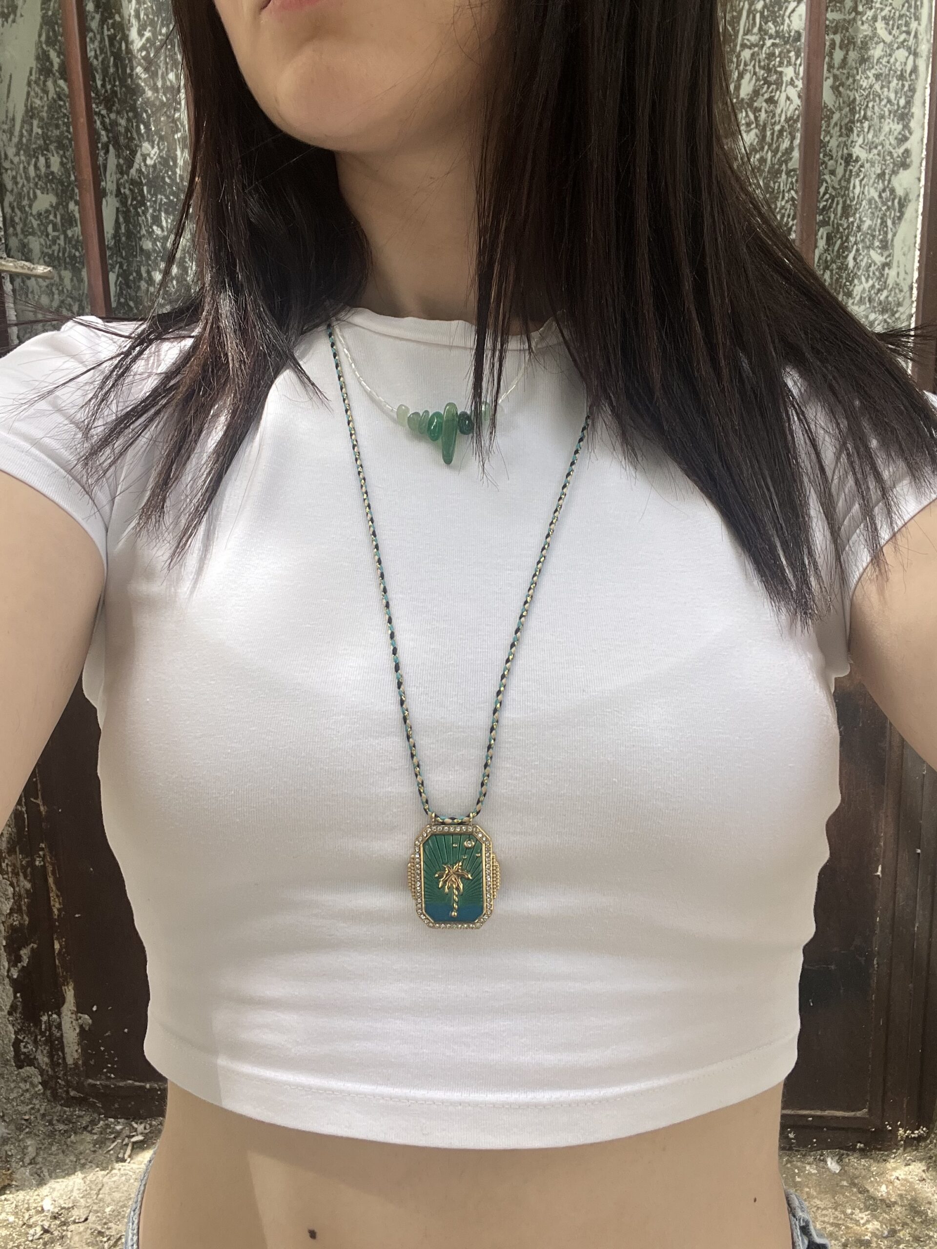 Φέρε λίγη καλοκαιρινή διάθεση στο look σου με το Tropical Dream. Ένα εντυπωσιακό μενταγιόν με φόντο πράσινο και γαλάζιο σμάλτο, διακοσμημένο με χρυσό φοίνικα και λαμπερές πέτρες.
