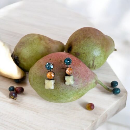 Χειροποίητα σκουλαρίκια της Artwear Dimitriadis από υποαλλεργικό ορείχαλκο χωρίς νικέλιο, διακοσμημένα με κρύσταλλα Swarovski σε αποχρώσεις σμαραγδιού, κεχριμπαριού και ιβουάρ. Ένα ρομαντικό κόσμημα με διακριτική πολυτέλεια, ιδανικό για ξεχωριστές εμφανίσεις.