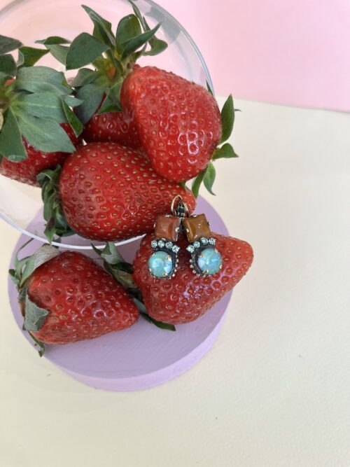 Οι γεωμετρικές καφέ πέτρες από χειροποίητο γυαλί προσδίδουν ζεστασιά και γήινη κομψότητα, ενώ τα λαμπερά μπλε κρύσταλλα Swarovski περιβάλλονται από διακριτικά λευκά στρας, χαρίζοντας εντυπωσιακή φωτεινότητα σε κάθε κίνηση.