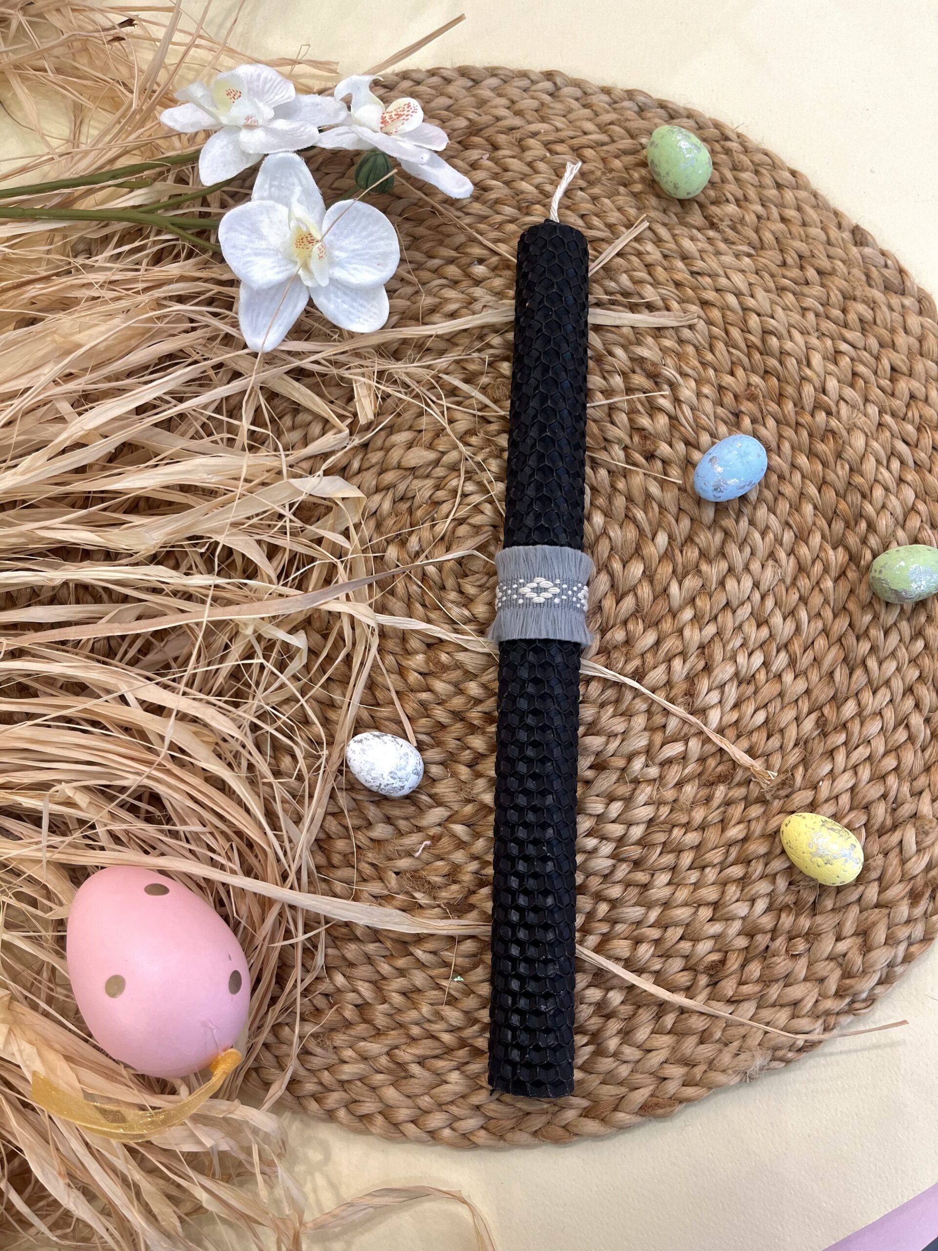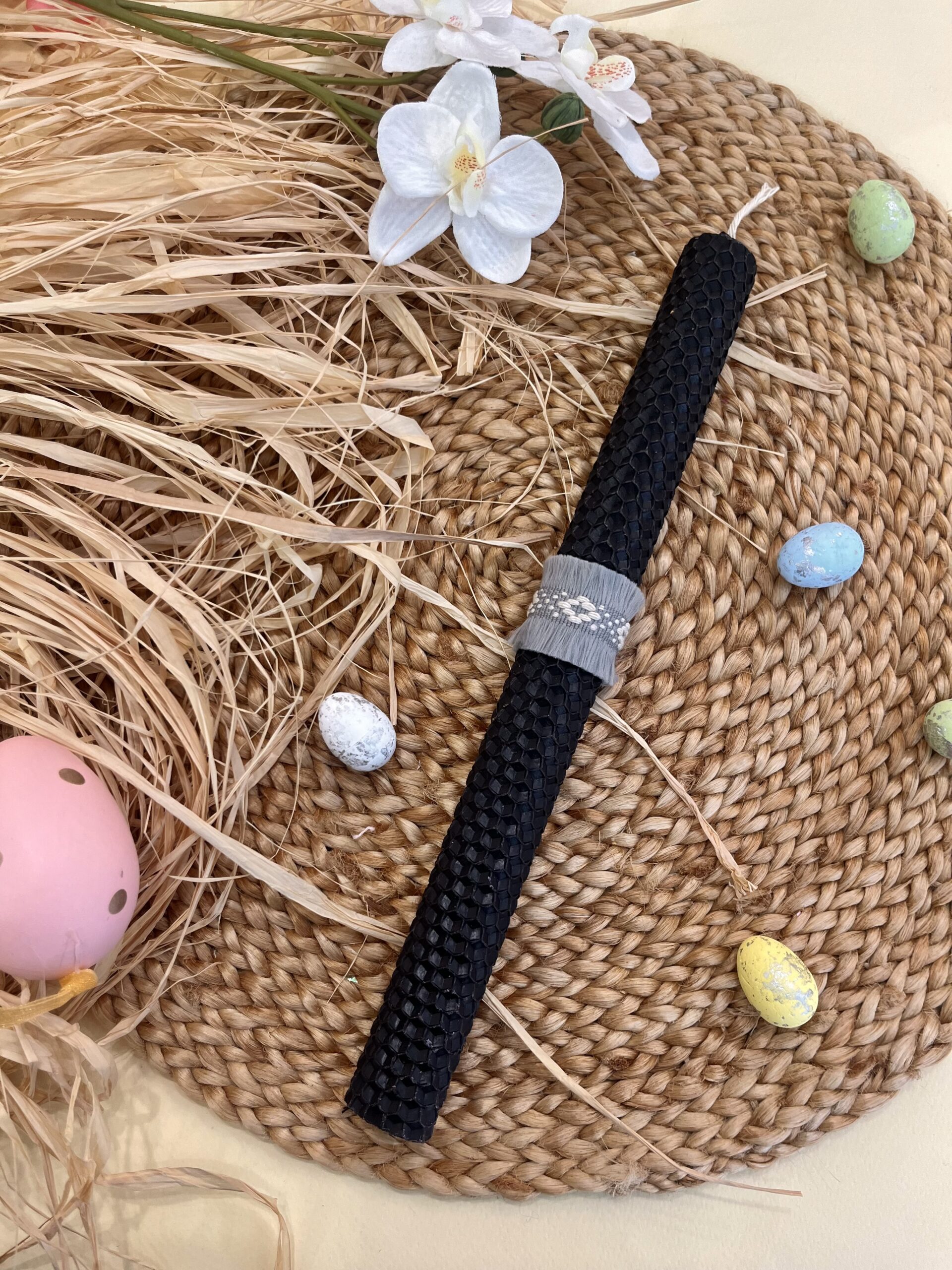 Χειροποίητη λαμπάδα κηρήθρα από φυσικό μελισσοκέρι σε μαύρη απόχρωση διακοσμημένη με μποχο υφαντές τρέσες.