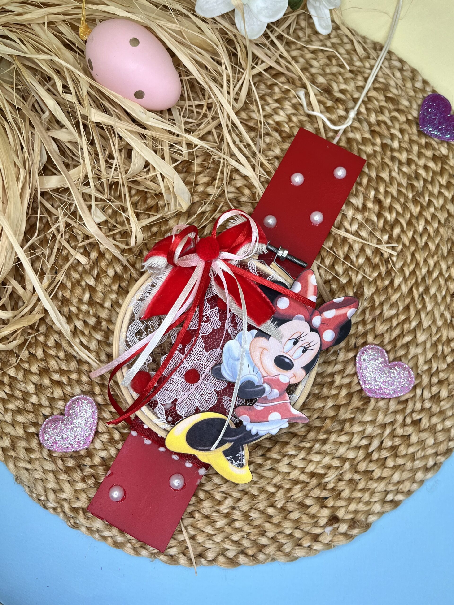 Χειροποίητη λαμπάδα διακοσμημένη με καδράκι με ξύλινη φιγούρα, ζωγραφισμένη στο χέρι διακοσμημένη με πέρλες.