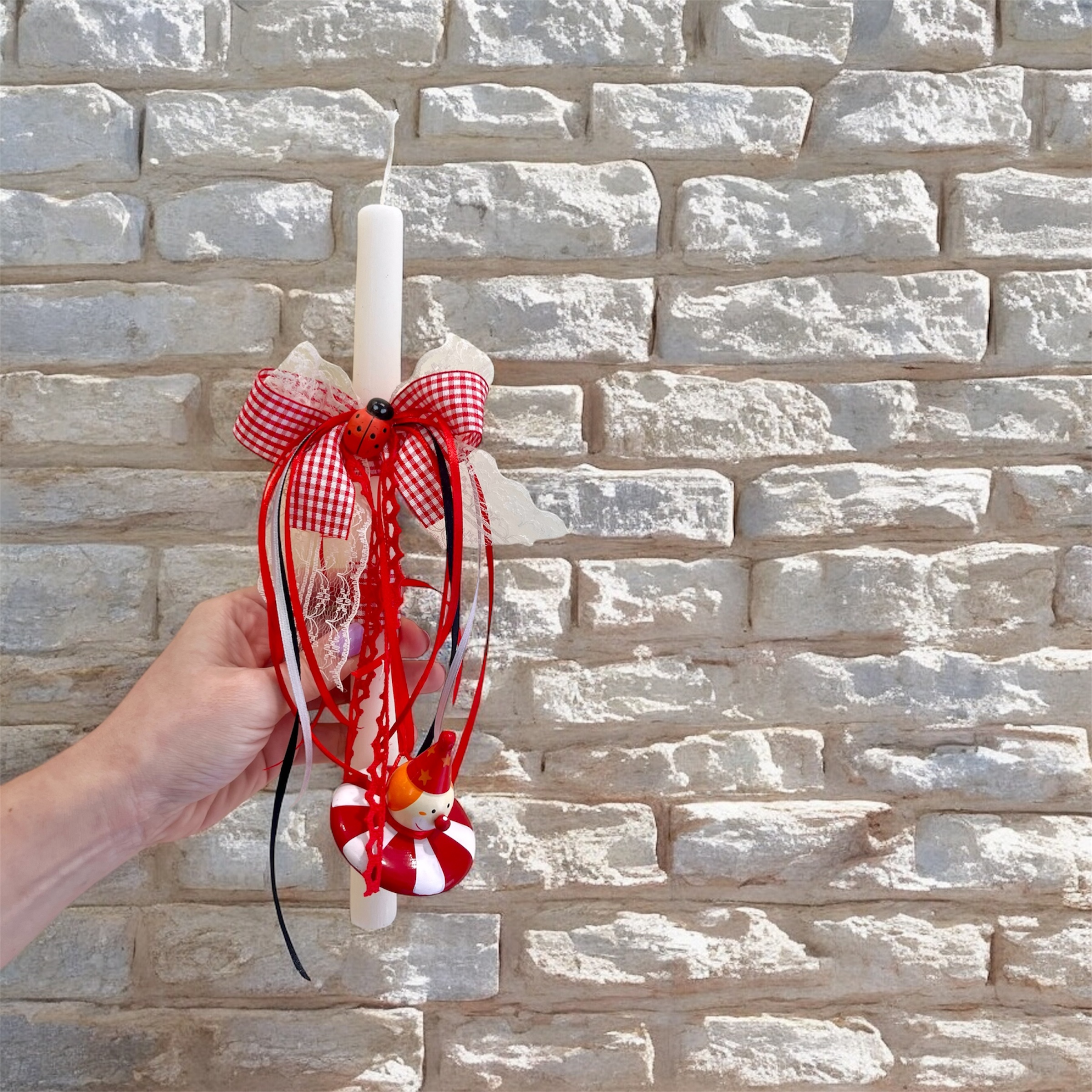 Ο στολισμός ολοκληρώνεται με όμορφες κορδέλες σε κόκκινες και φυσικές αποχρώσεις, καρό φιόγκο και μικρές διακοσμητικές λεπτομέρειες που δίνουν στη λαμπάδα ένα παραδοσιακό αλλά ταυτόχρονα μοντέρνο στυλ. Το λούτρινο διακοσμητικό είναι χειροποίητο και ιδανικό για μωρά καθώς είναι φτιαγμένο από υπό αλλεργικά υλικά.