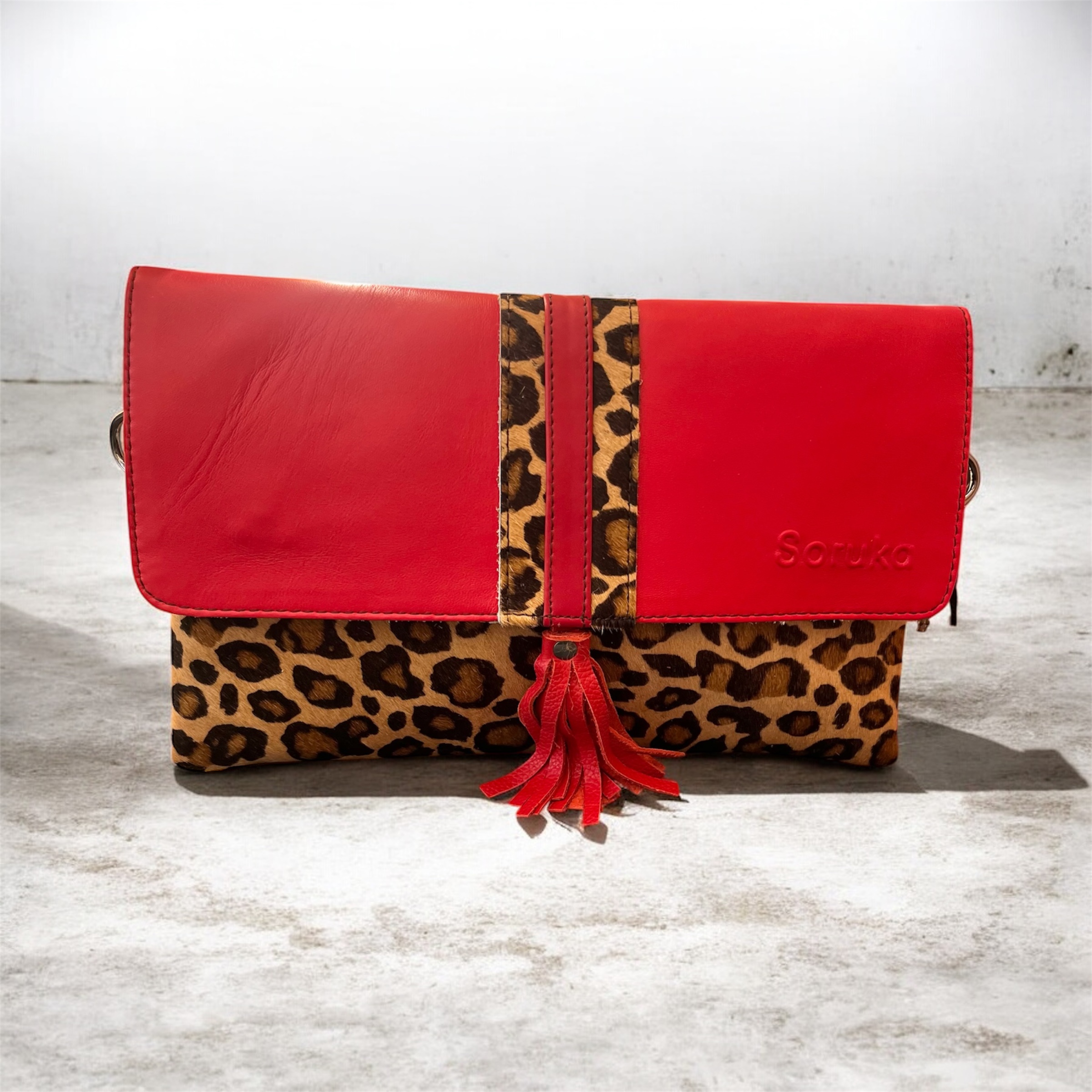 Χειροποίητη τσάντα από 100 % ανακυκλωμένο δέρμα σε απόχρωση του κόκκινου με animal print.