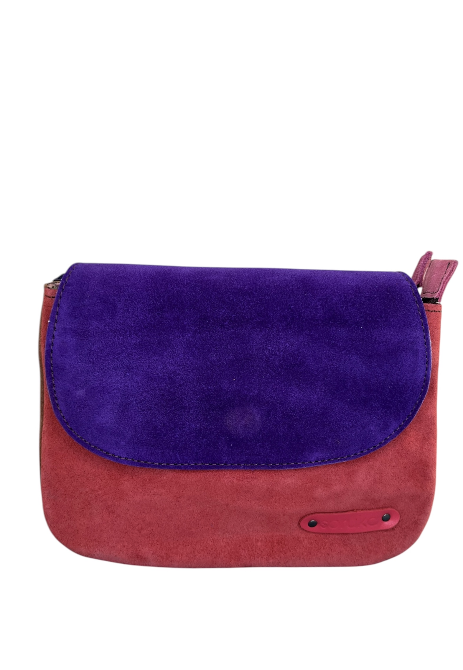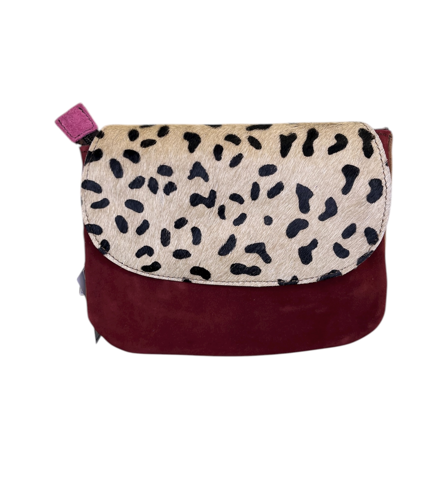 Χειροποίητη τσάντα από 100 % ανακυκλωμένο μαλακό σουέτ δέρμα σε αποχρώσεις του μπορντώ , του κεραμιδί και του μωβ με αναστρέψιμο κλείσιμο animal print ώστε να μπορεί να φορεθεί και από τις δυο πλευρές.